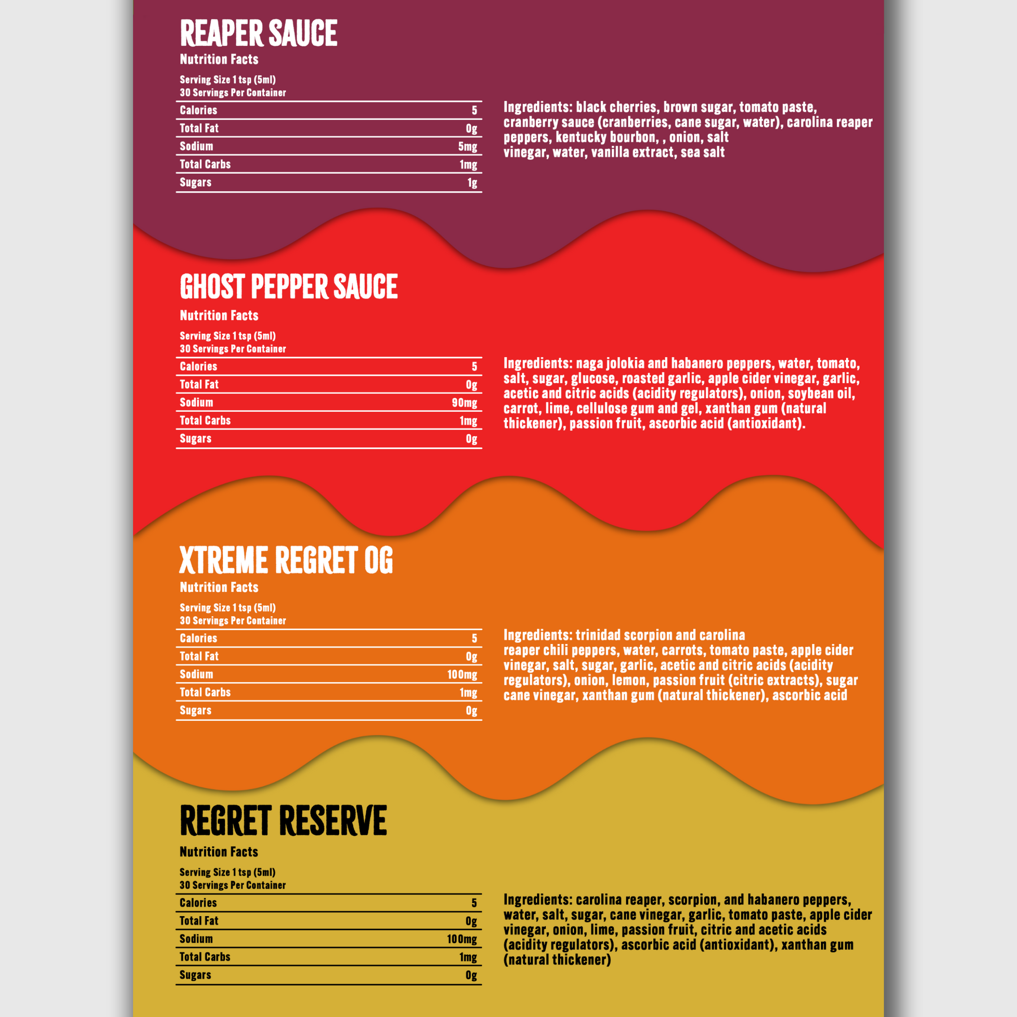- Xtreme Regret - A super hot burn made with Carolina Reaper, Trinidad Scorpion, garlic and lime juice (800,000 Scoville Heat Units)