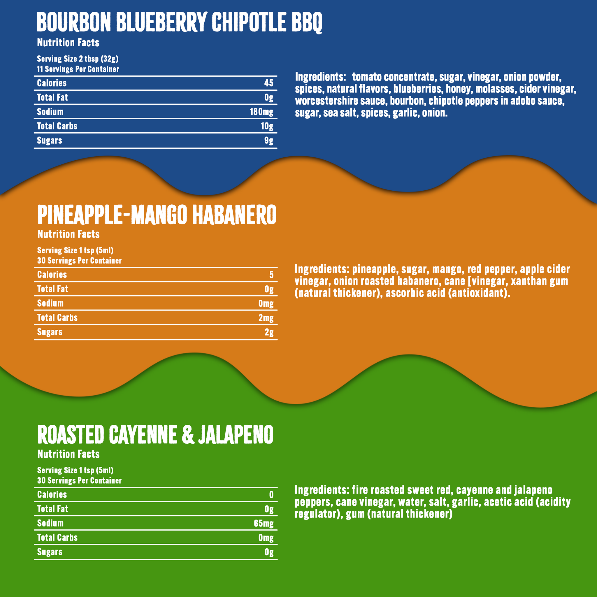 - Carolina Reaper sauce - Sweet heat made with black cherries, cranberries, Carolina Reaper, and Kentucky Bourbon (350,000 Scoville Heat Units)