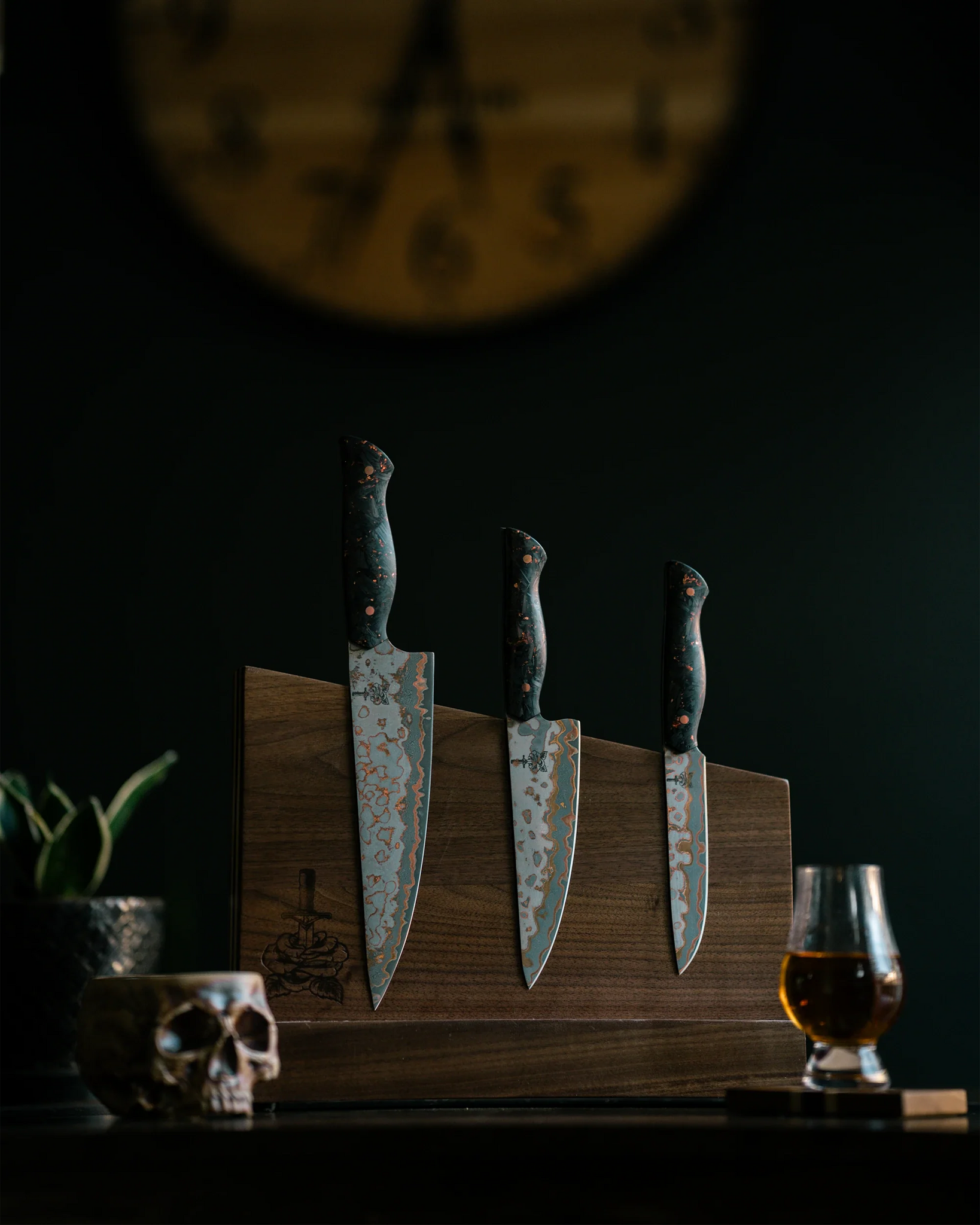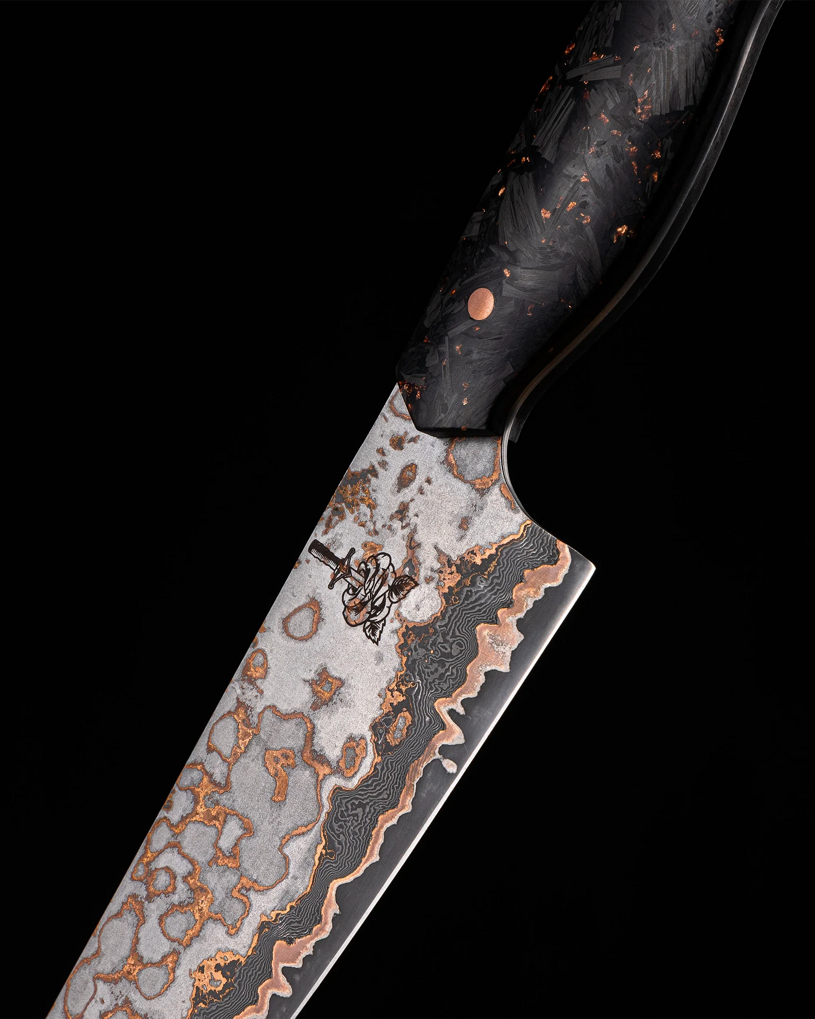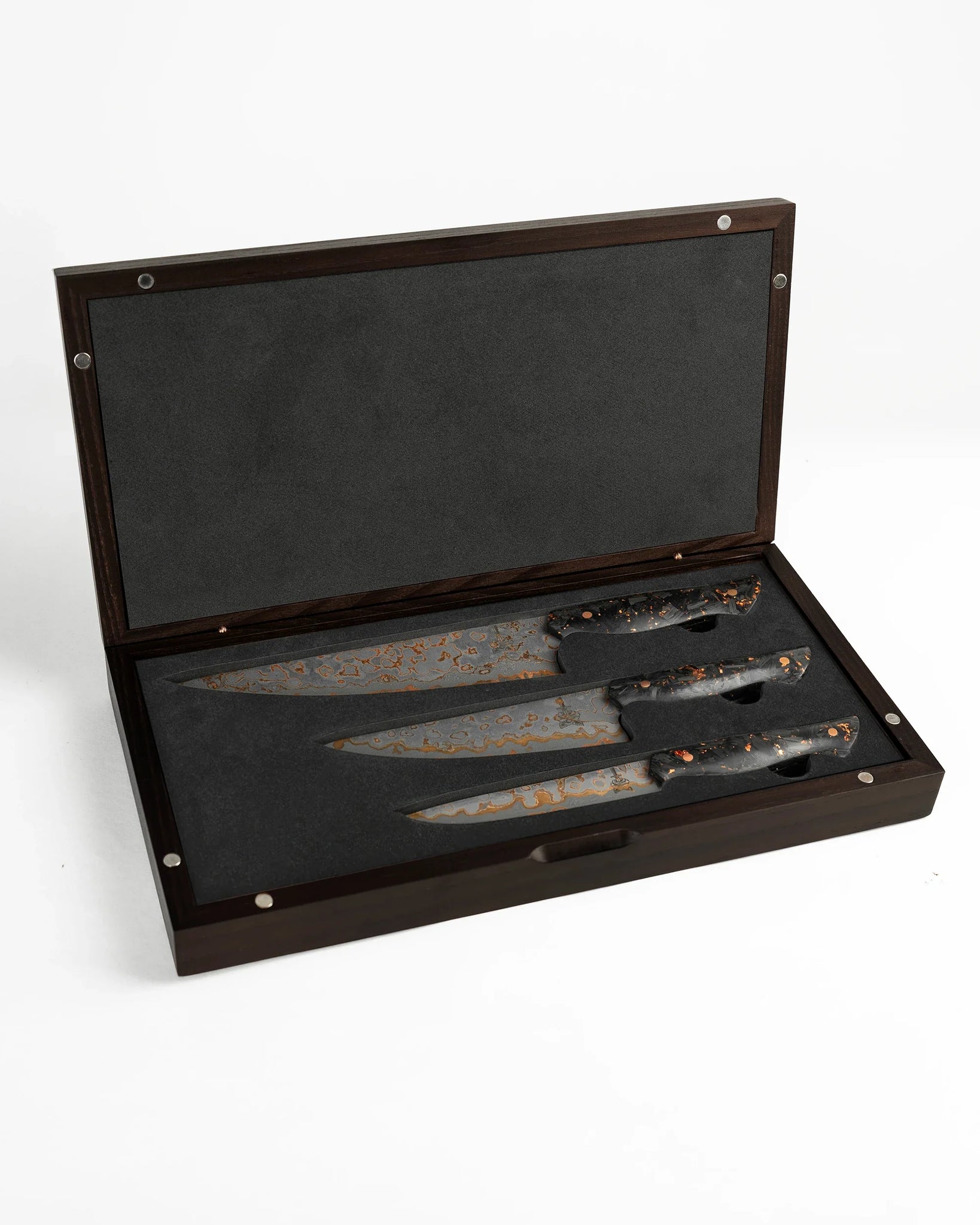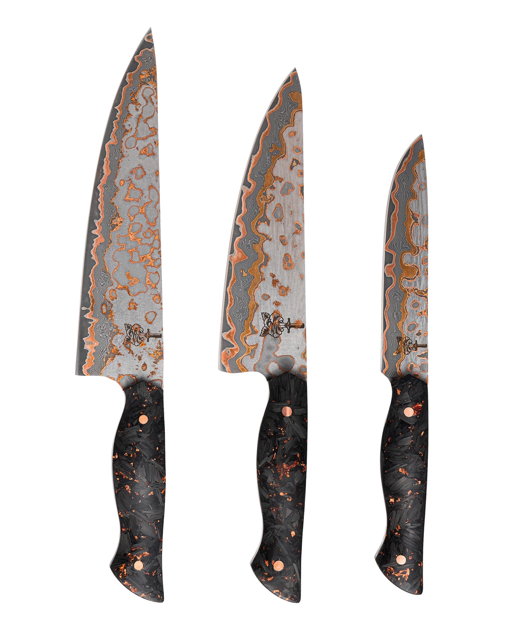The set includes an 8” Chef Knife, 6” Chef Knife, and a Paring Knife, each outfitted with a forged carbon fiber handle speckled with copper flakes. This adds a fierce, edgy contrast to the dark, Damascus-patterned blades, embodying a sinister yet striking allure. The handle feels rugged in the hand, while the blade’s hard 62 HRC core ensures a razor-sharp edge that stands up to any task you throw at it.