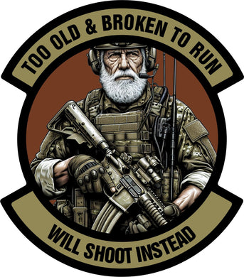 STICKER - Too Old & Broken to Run - Will Shoot Instead - 4"