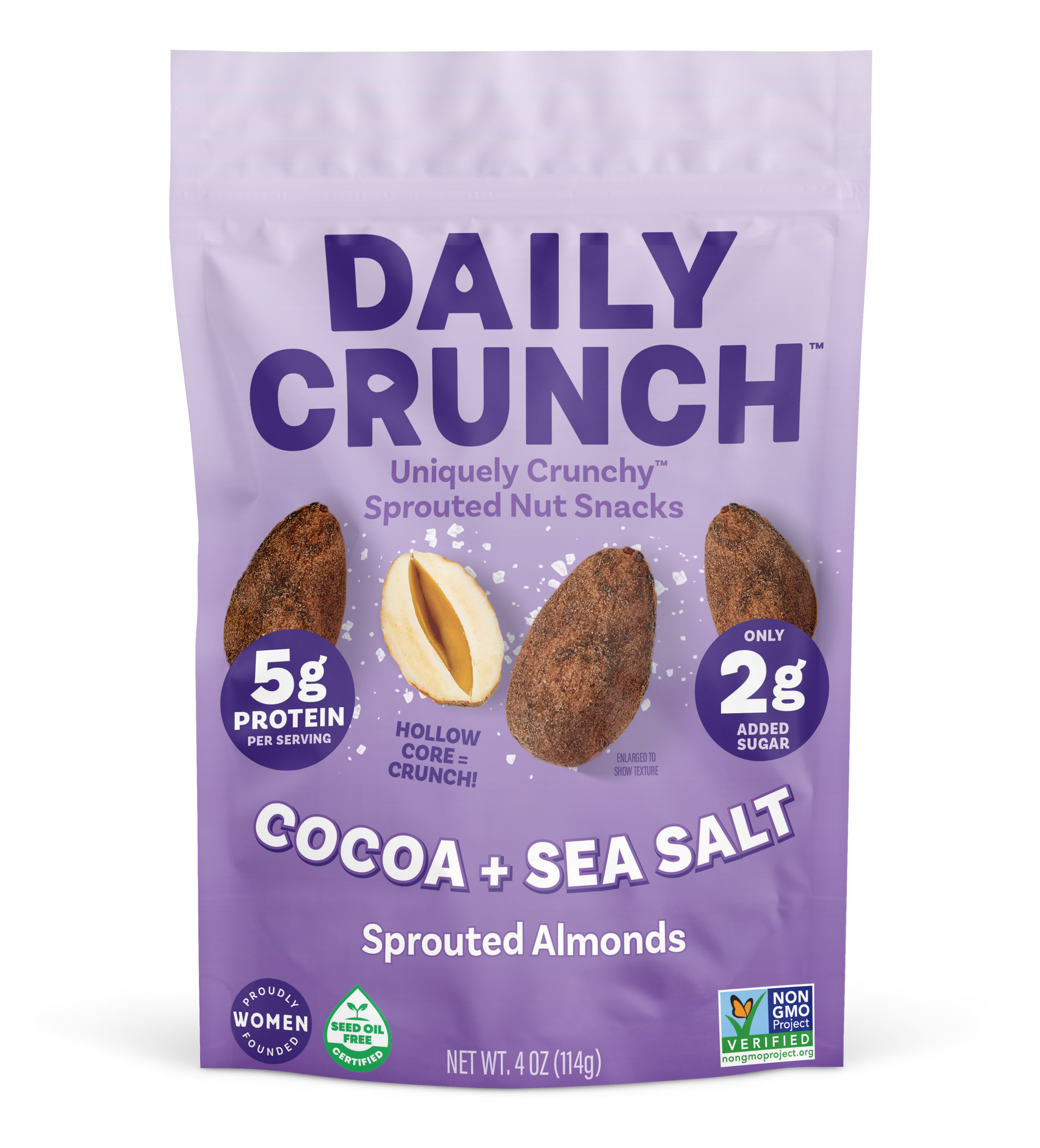 Elevate your snacking with Cocoa + Sea Salt Sprouted Almonds. Lightly sweetened with coconut sugar and finished with cocoa, sea salt, and a touch of Madagascar vanilla, every bite is Uniquely Crunchy™ and deeply satisfying.