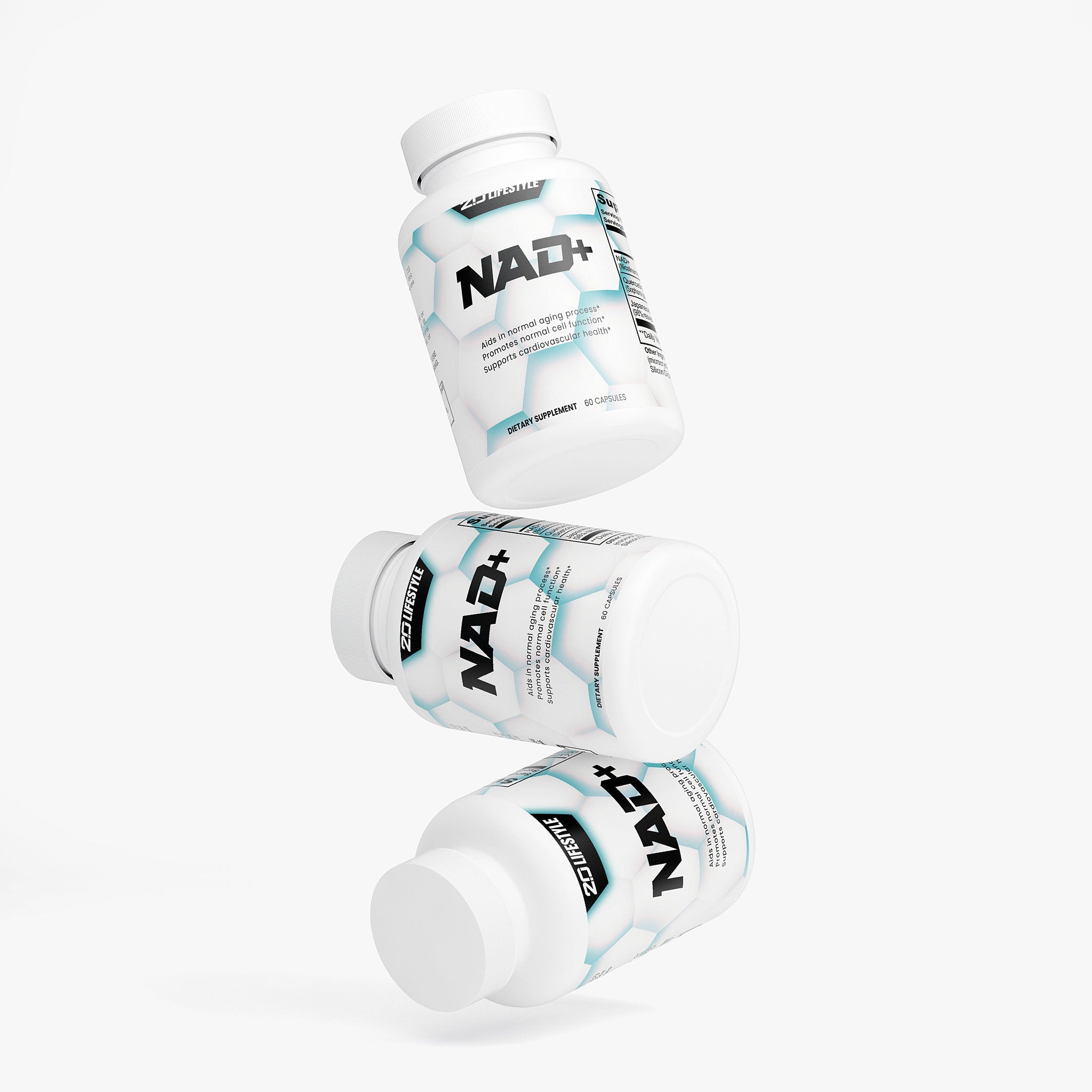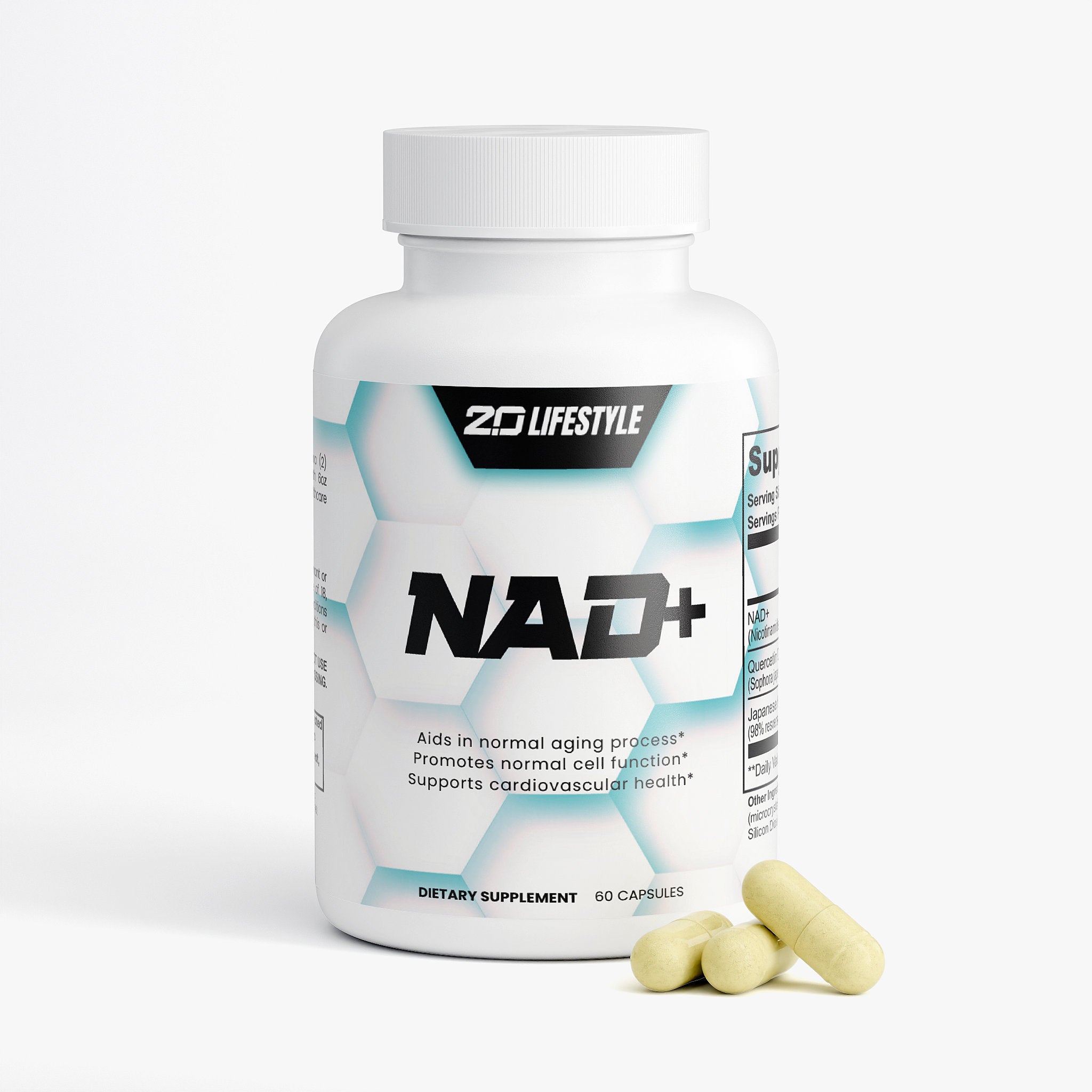 Ingredients: NAD+ (Nicotinamide Adenine Dinucleotide) (500 mg), Quercetin Dihydrate Extract (Sophora japonica) (whole flower bud) (250 mg), Japanese Knotweed Extract (98% Resveratrol) (Polygonum cuspidatum) (root) (150 mg), HPMC (vegetable capsule), Microcrystalline Cellulose (MCC), Brown Rice Flour, Olive Oil, Silicon Dioxide, Magnesium Stearate.